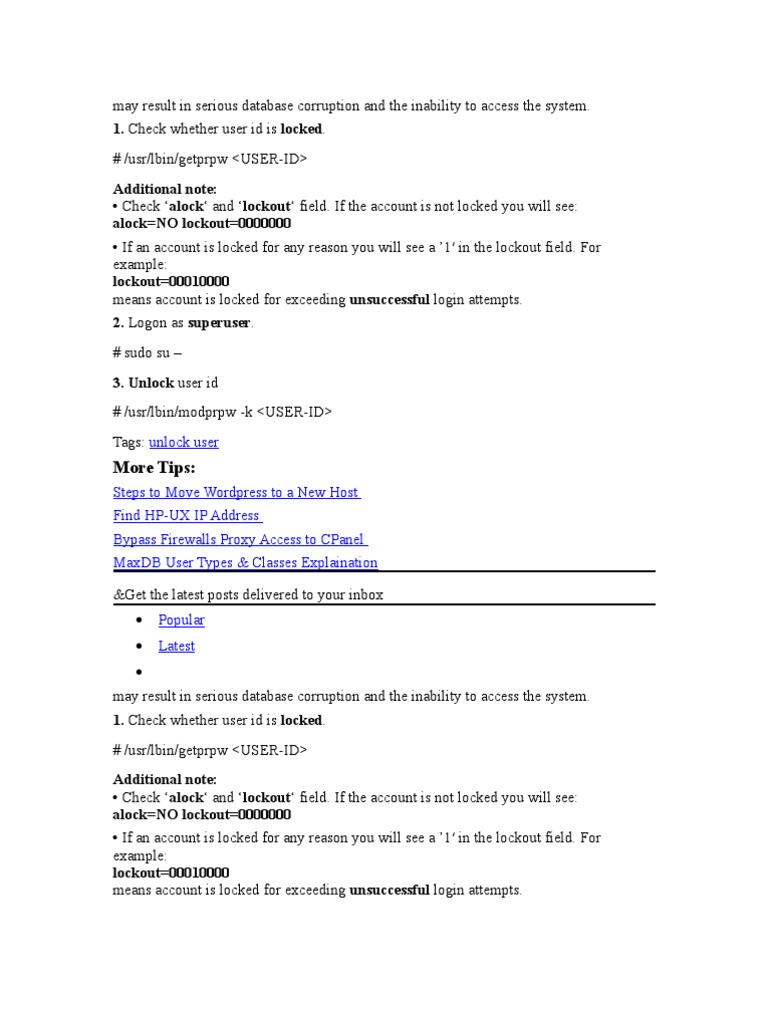 Activating Emergency User Sap In Abap Sap Basis Tuts from www.sapbasistuts.com Unlocking password for user username. Education 7 hours ago the /etc/shadow file stores actual password in encrypted format (more like the hash of the password) for user's account.on linux, we use the passwd command for changing passwords.it can also lock a user account.the same command is used to unlock a user account too. Let us see how to unlock the user account using … Jan 11, 2012 · some times on linux boxes the user account will be locked due to issues such as wrong password entry, account expiry etc. In this post we will see how to unlock user account with different commands. Aug 07, 2016 · option 1: On linux, we use the passwd command for changing passwords. Check if the password is disabled by viewing /etc/shadow file for user entry.